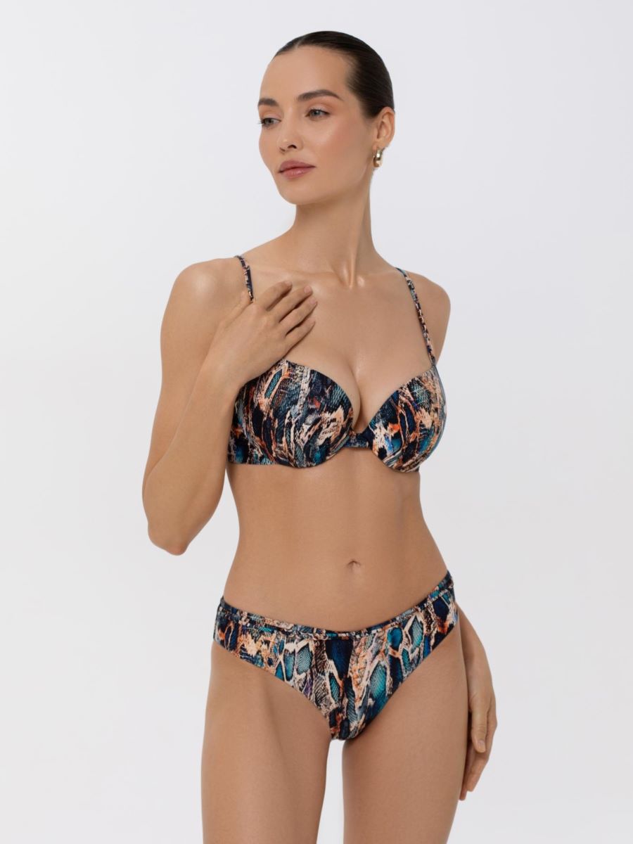 Верх купальника с формованными чашками со съемными корректорами “пуш-ап” на косточках. На спине застежка. Регулируемые бретели декорированы аксессуарами.