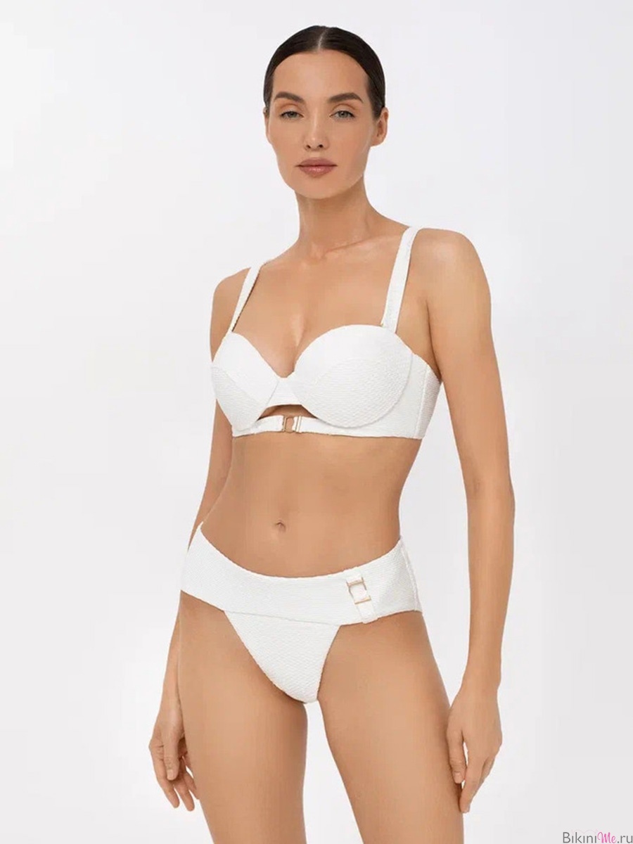 Раздельный купальник с чашкой-бандо на каркасной поддержке. Между чашками декоративный вырез и эластичная резинка с аксессуаром. Съемные широкие бретели, есть дополнительный комплект классических бретелей. На спине застежка.