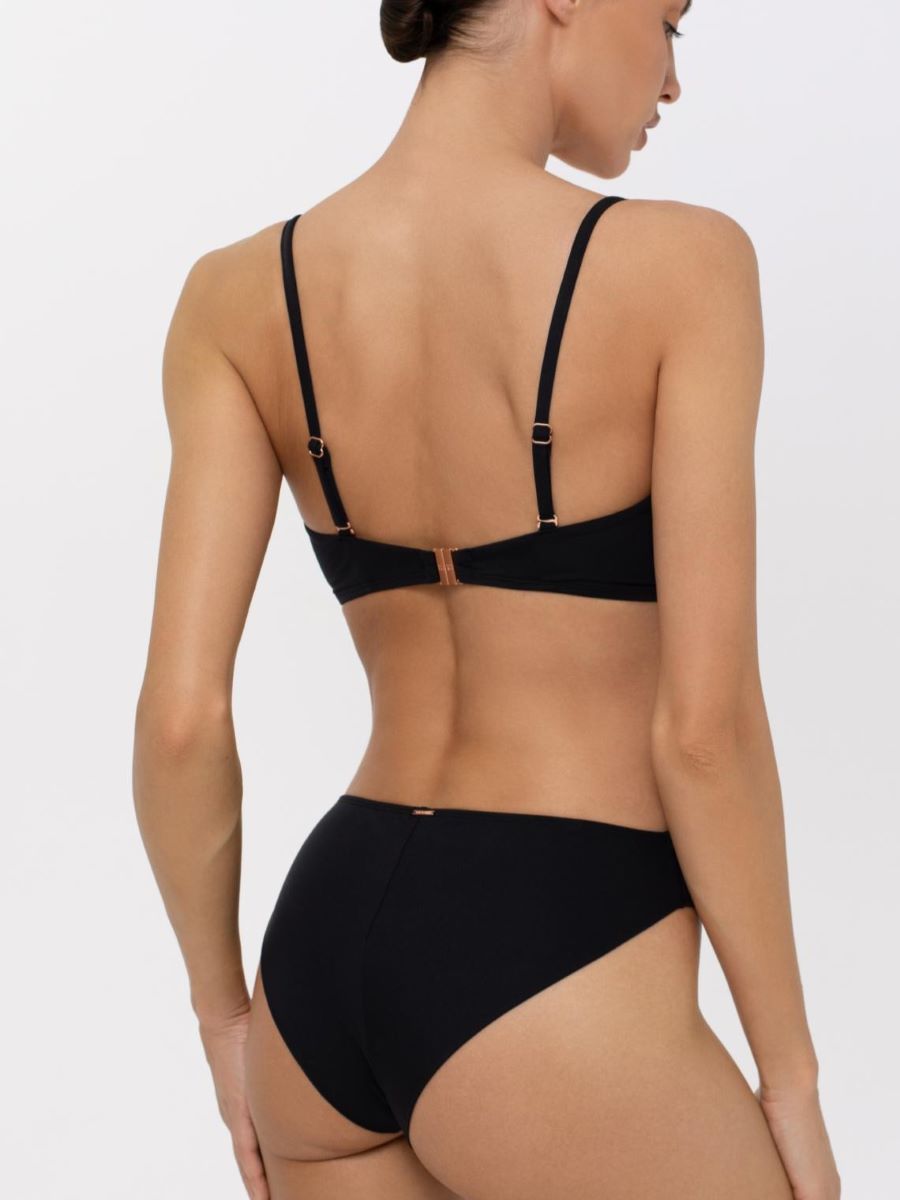 Верх купальника бандо с формованными чашками на косточках. Съемные бретели регулируются по длине. На спине застежка. Спереди по центру декоративный золотой аксессуар с логотипом бренда.