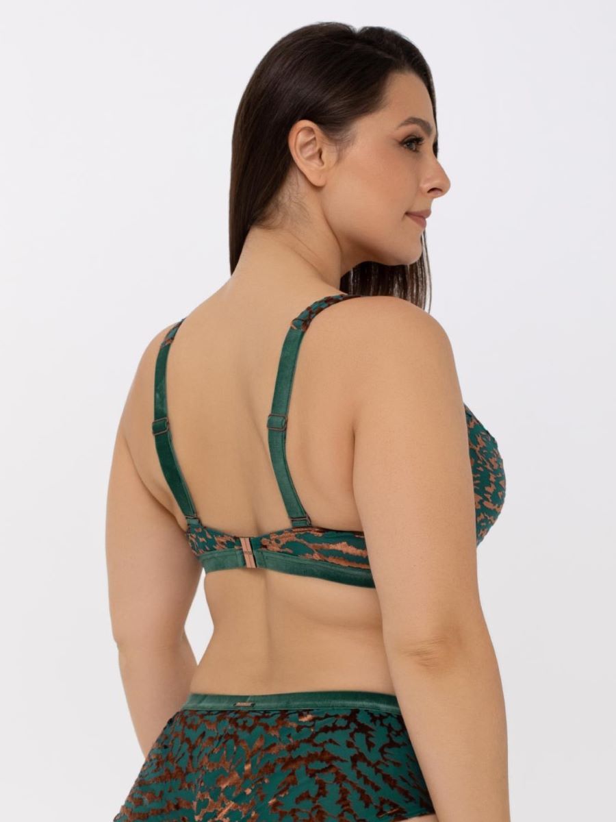 Мягкая чашка с тонкими съемными корректорами на косточках. Подойдет для обладательниц пышных форм. Углубленная линия декольте подчеркивается фигурным вырезом. Регулируемые бретели. Наспине застежка.