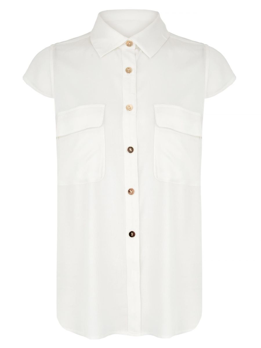 Летняя блуза на пуговицах с короткими рукавами-крылышками из вискозы. Спереди накладные карманы.
