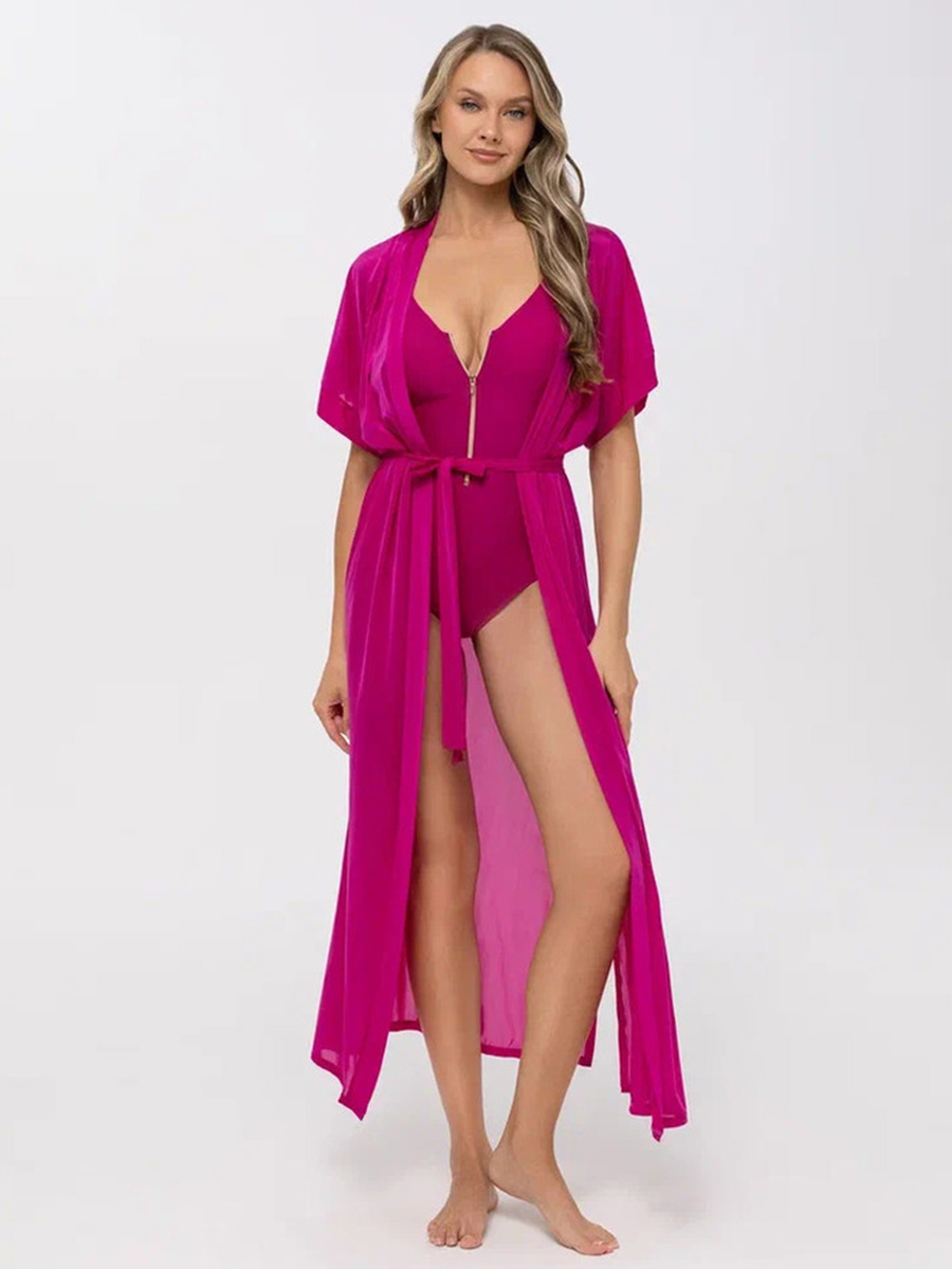 Летняя туника макси с коротким рукавом. Разрезы по бокам. Съемный завязывающийся пояс. Струящаяся воздушная полупрозрачная эластичная ткань.