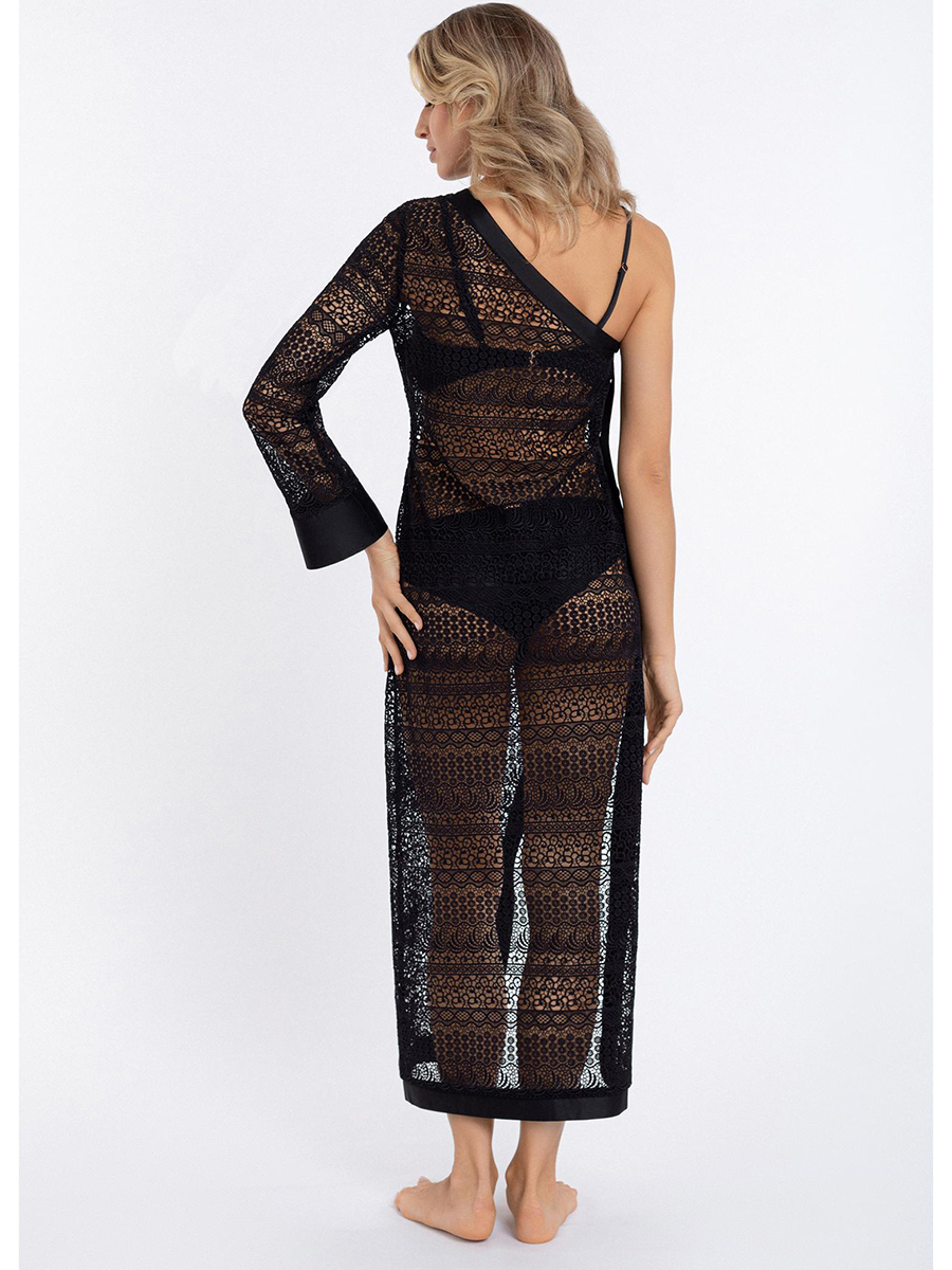 Пляжное платье из гипюра на пуговицах с ассиметричным кроем по линии декольте на одно плечо. С одной стороны высокий разрез.