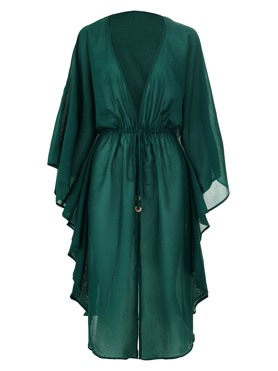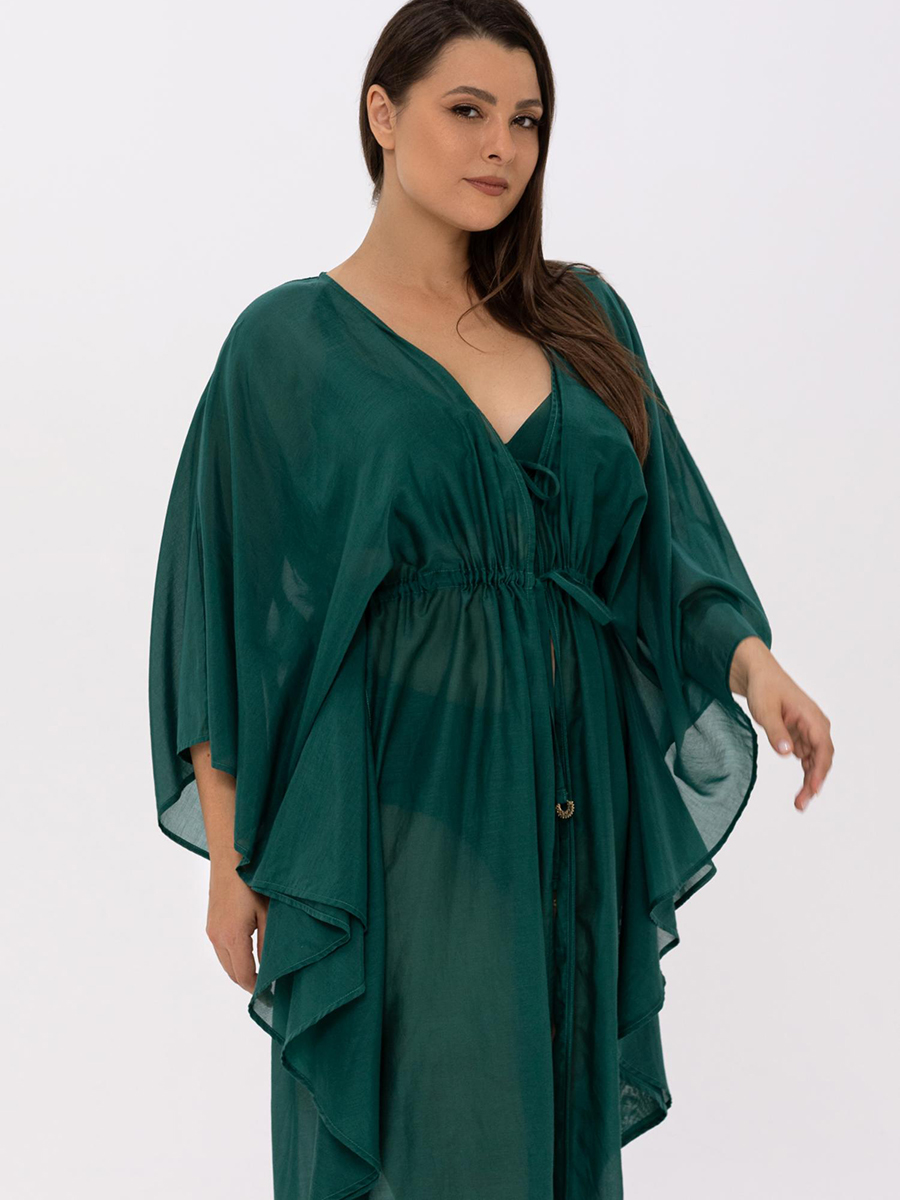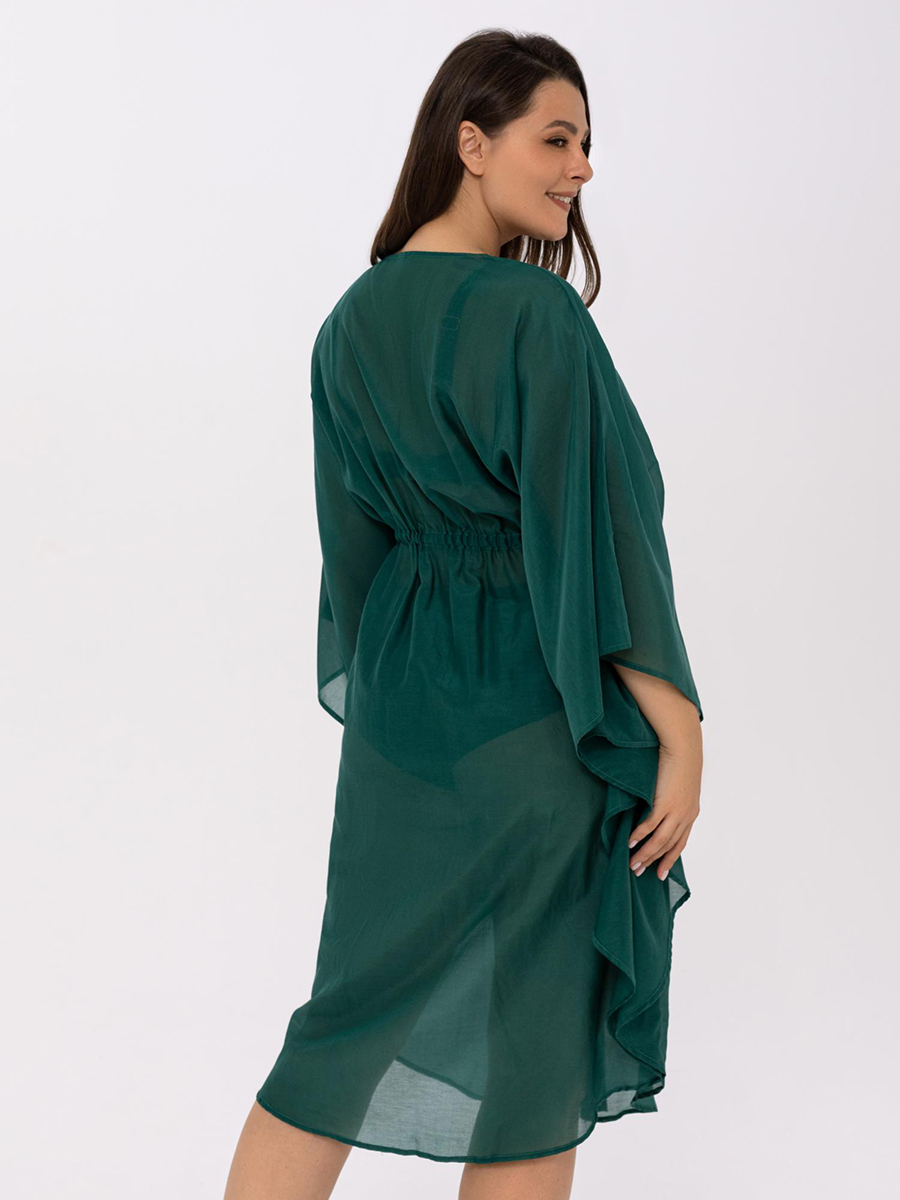 Легкая летняя туникаиз шелка и хлопка свободного прямого кроя, длина до уровня колен. V-образный вырез горловины. Рукава напоминают крылья бабочки. Съемный пояс.