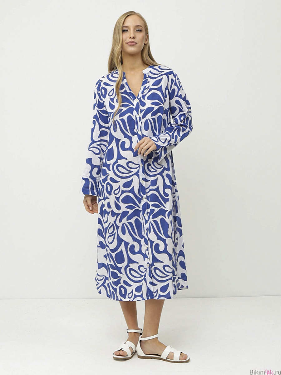 Летнее женское платье итальянского бренда FABRETTI выполнено из высококачественного хлопка. Удобное, легкое, приятное к телу. Свободный крой обеспечивает максимальный комфорт и свободу движений, а длина миди подчеркивает элегантность и женственность. Платье украшено ярким принтом. Платье застегивается на пуговицы спереди, а длинные рукава обеспечивают комфорт и свободу движений. Вырез V-образный добавляет образу женственности и утонченности.