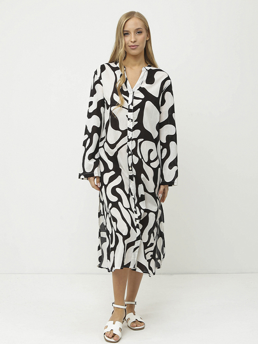 Летнее женское платье итальянского бренда FABRETTI выполнено из высококачественного хлопка. Удобное, легкое, приятное к телу. Свободный крой обеспечивает максимальный комфорт и свободу движений, а длина миди подчеркивает элегантность и женственность. Платье украшено ярким принтом. Платье застегивается на пуговицы спереди, а длинные рукава обеспечивают комфорт и свободу движений. Вырез V-образный добавляет образу женственности и утонченности.