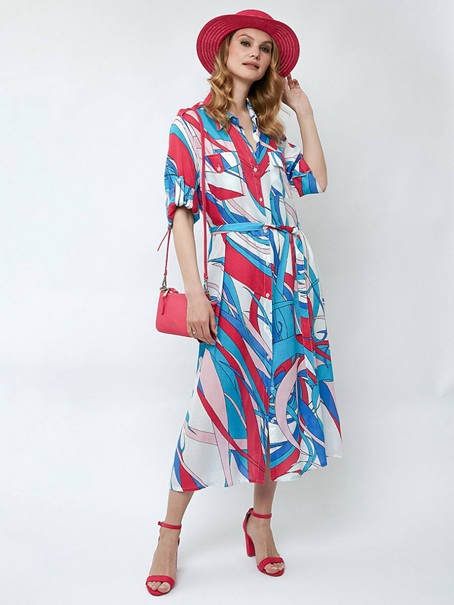 Платье-рубашка на пуговицах и с поясом, выполнена из вискозной ткани с ярким принтом