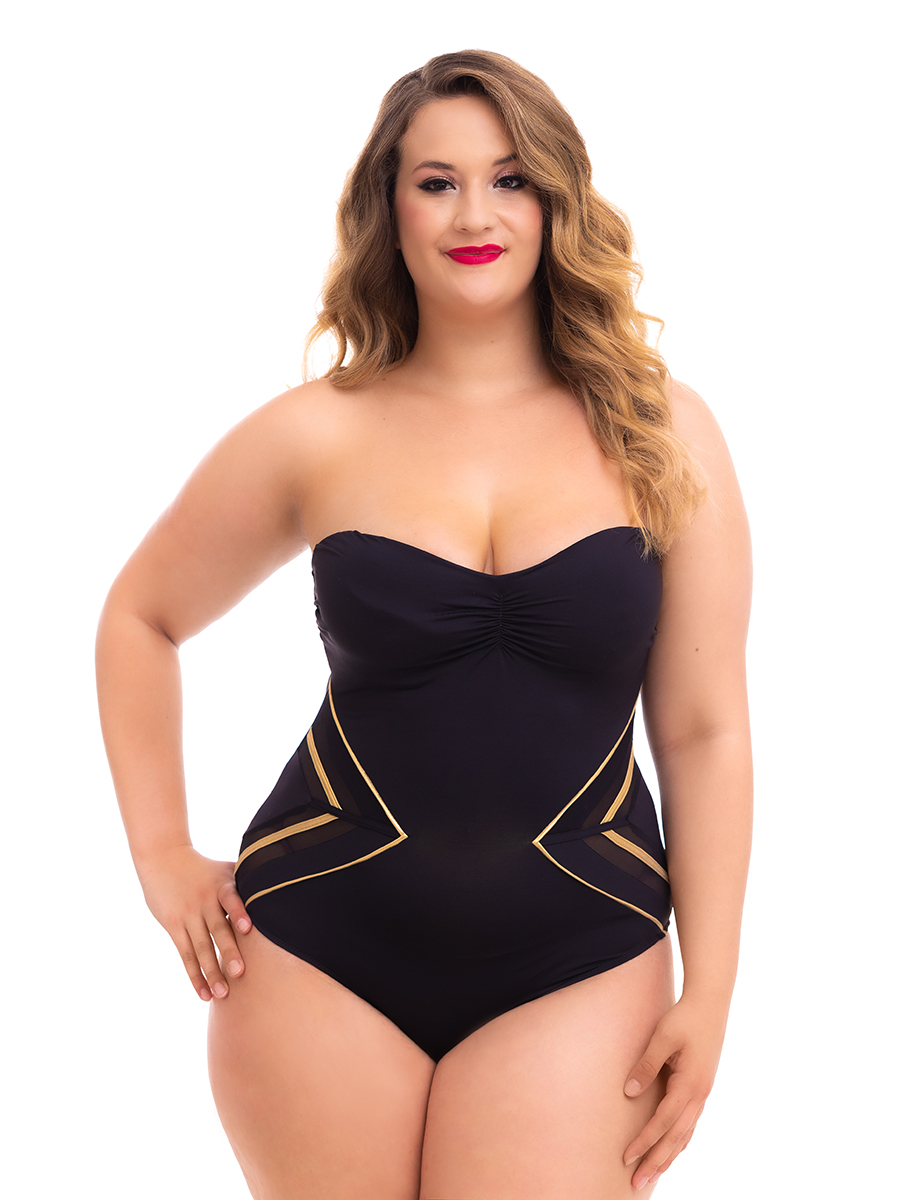 Слитный купальник-бандо на поролоновой чашке с костью. Бретельки отстегиваются. Форма кроя и золотистые вставки, визуально дают дополнительную коррекцию фигуры