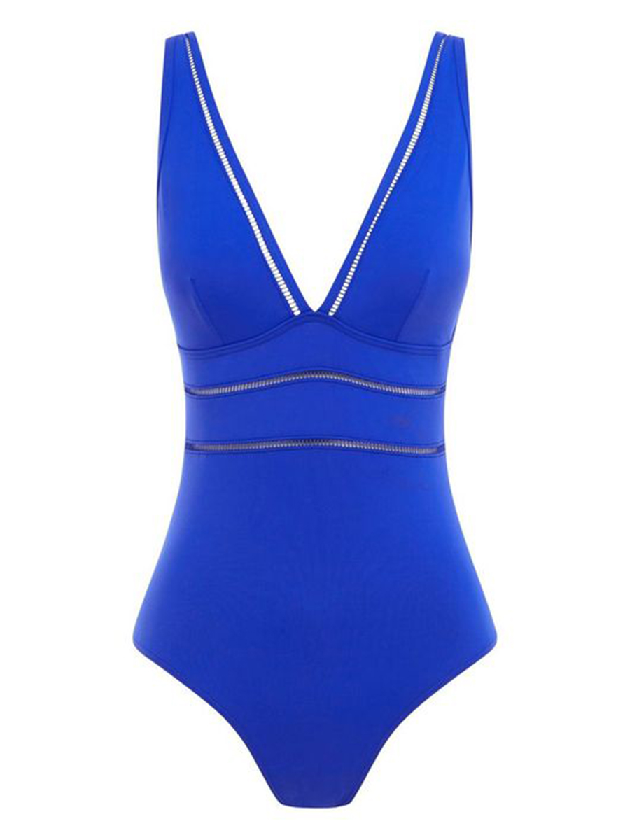 Слитный купальник с треугольными чашечками и поддерживающим подкладом Powermesh с эффектом скульптурирования и круговой утяжки для создания идеального силуэта. У модели с перфорированным узором Ladder Trim на V-образном декольте и линии талии предусмотрели бретели, которые можно перекрестить сзади.