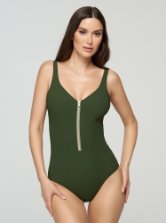 Слитный купальник с вшитыми поролоновыми корректорами и поддерживающей резинкой под грудью. По центру передней детали силиконовая молния